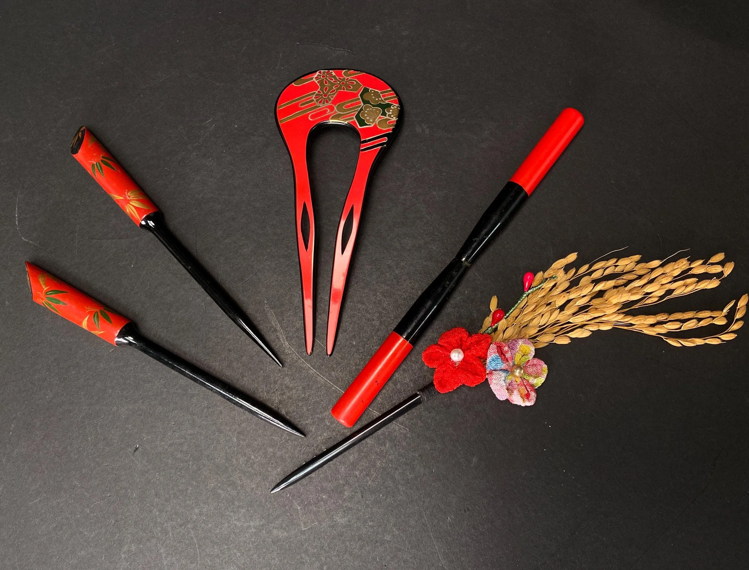 These are Kanzashi with hand painted red & black lacquer ware with flowers and Base made from resin with traditional Japanese designs in red tones.