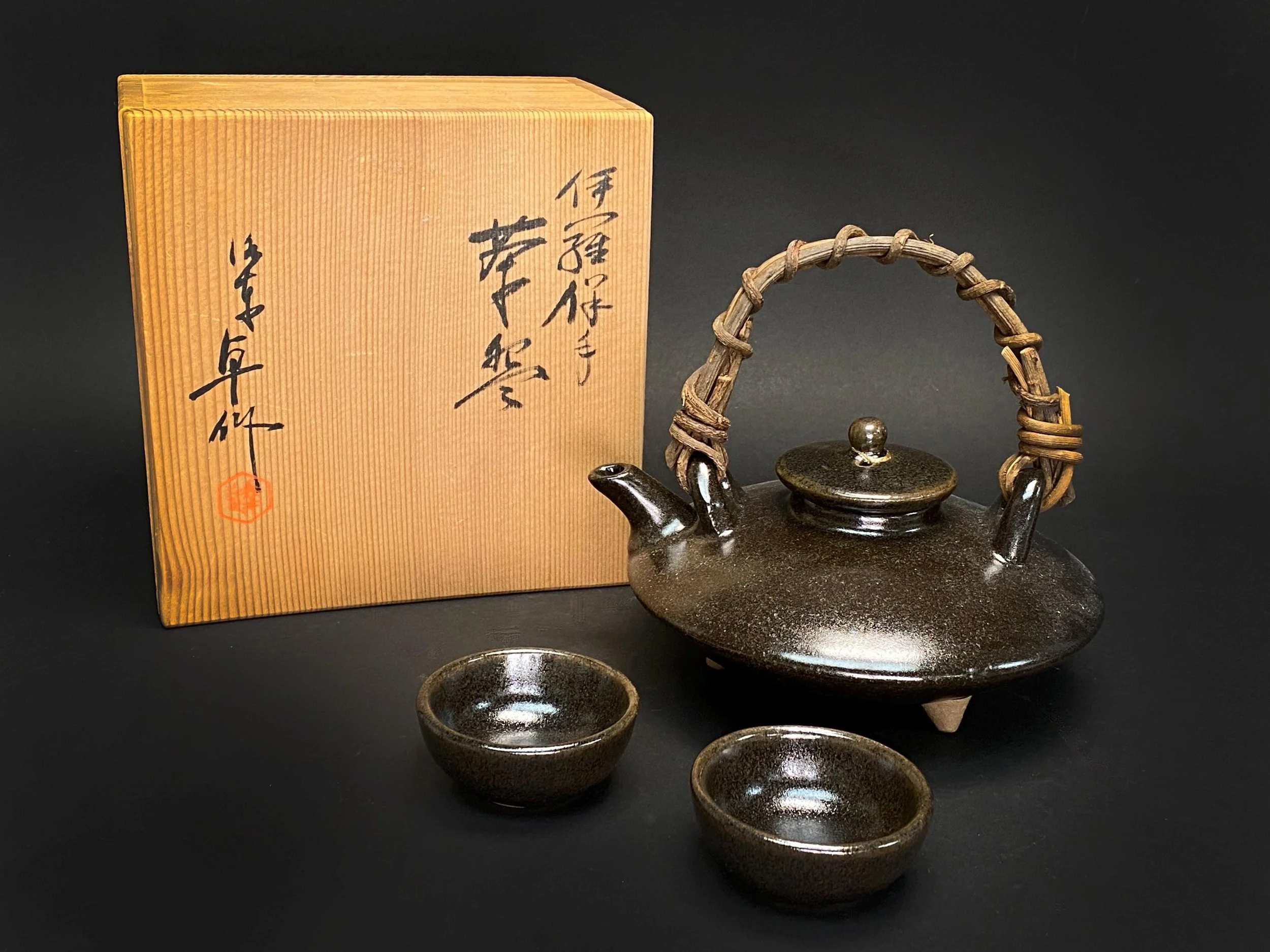 -Includes: 1 sake pot with kintsugi lid + 2 cups + original signed wood box