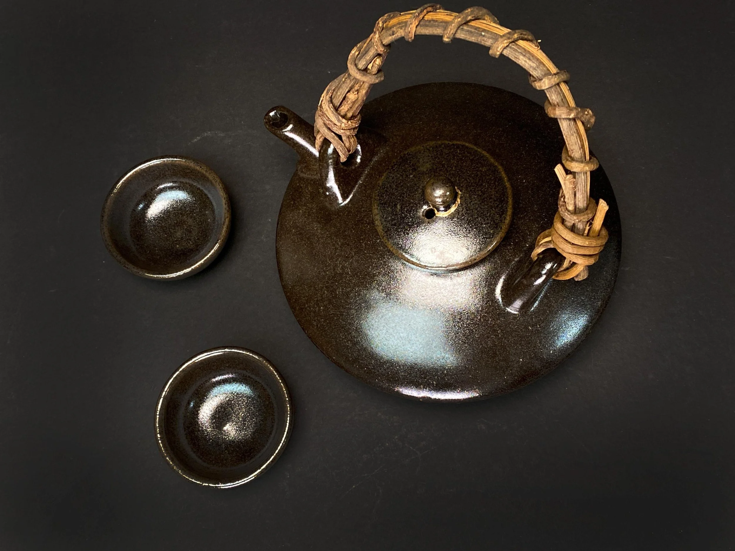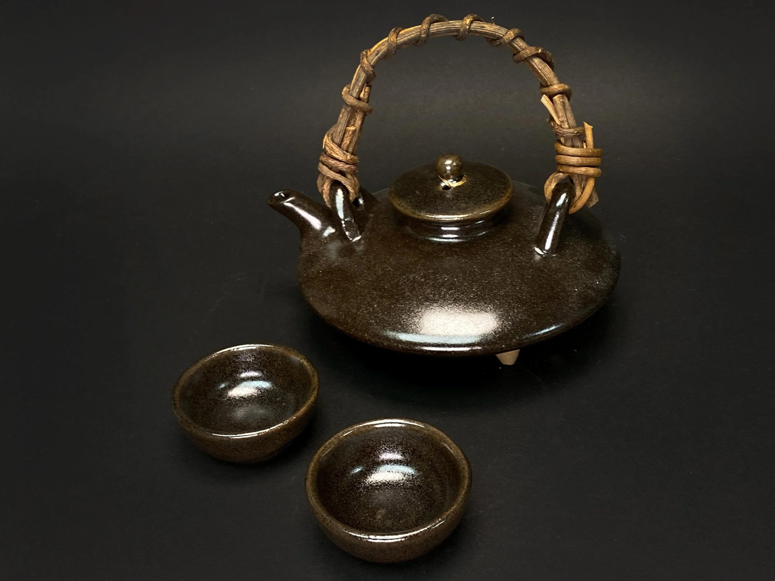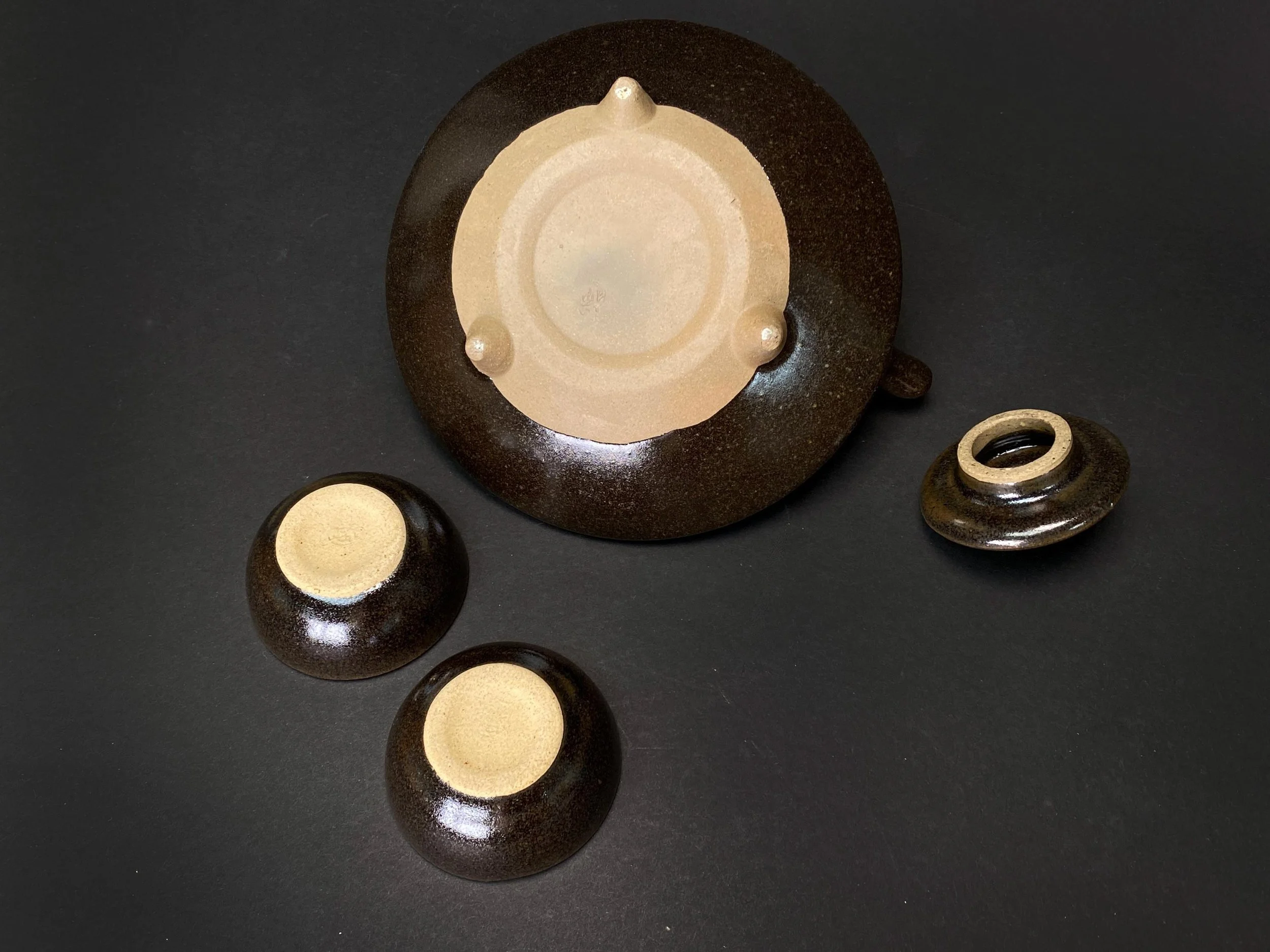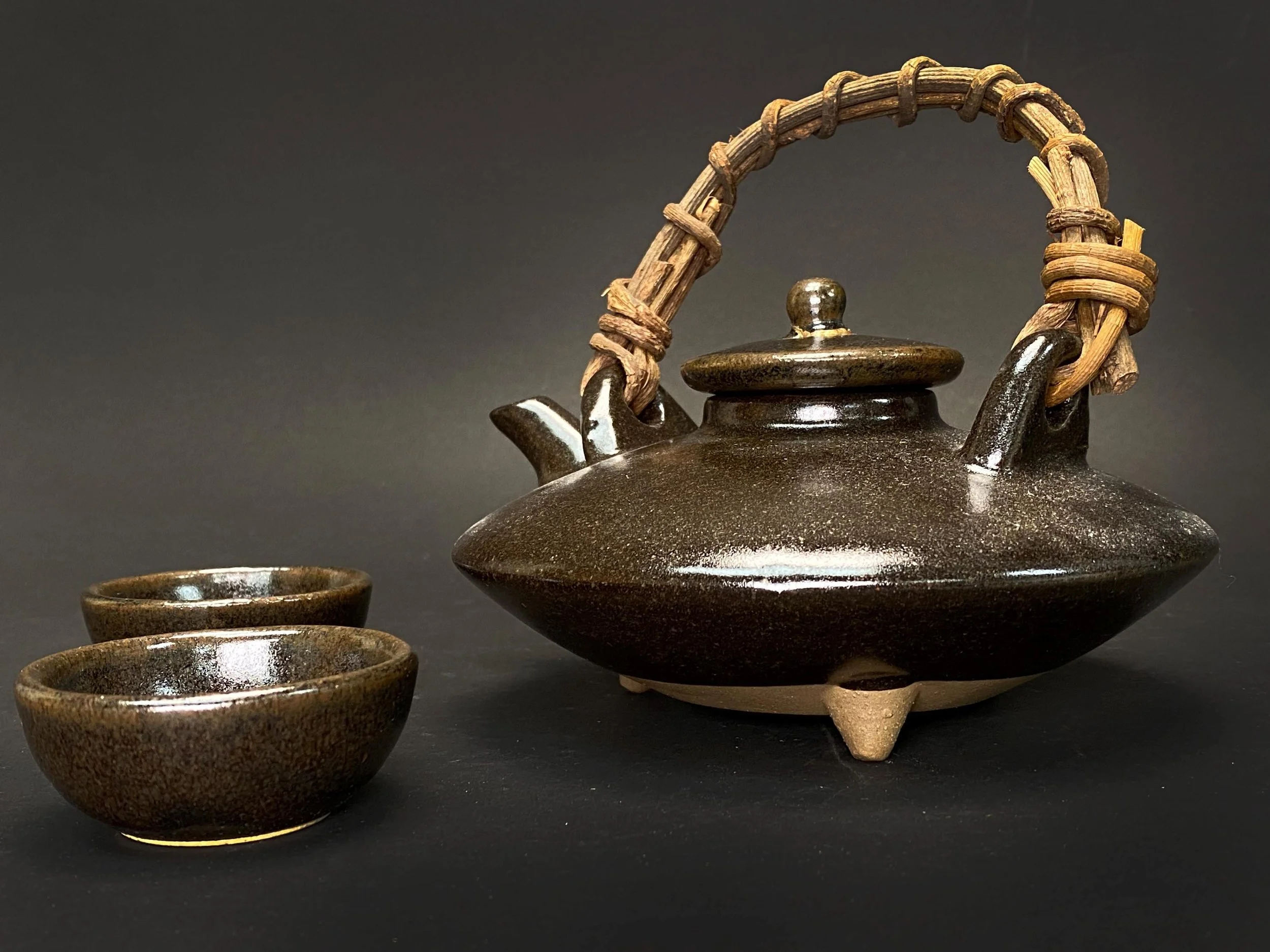 The lid of the pot has been carefully repaired using the traditional kintsugi technique, a beautiful golden mend that turns imperfection into art. The set includes two cups and the original tomobako (signed wooden box), perfect for collectors and lovers of Japanese tea or sake rituals.