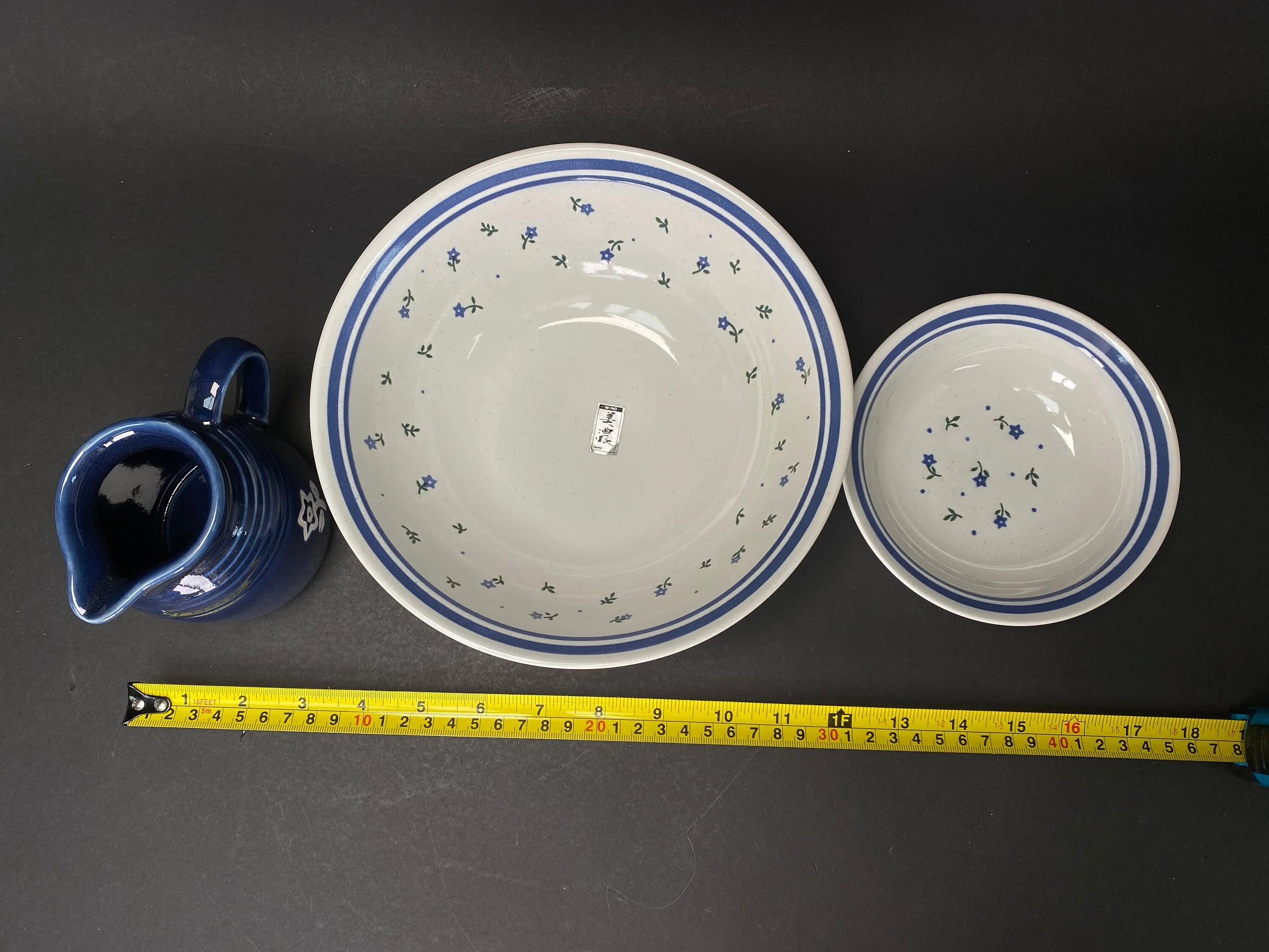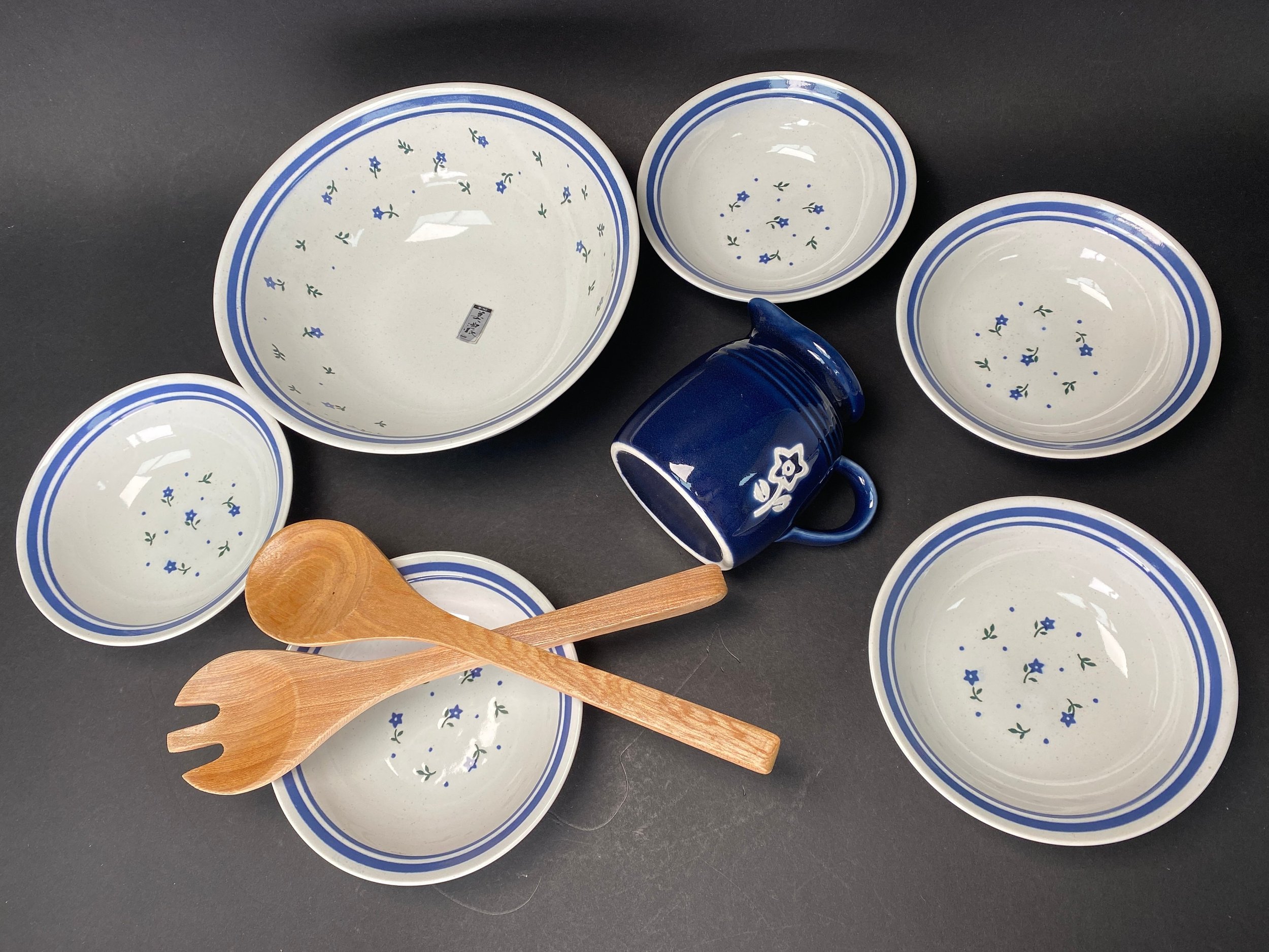This set of 9 includes 5 rice bowls, 1 sauce pot and 1 big salad bowl with big wood fork and spoon. The Dishes are well kept like NEW (no used) with original box.